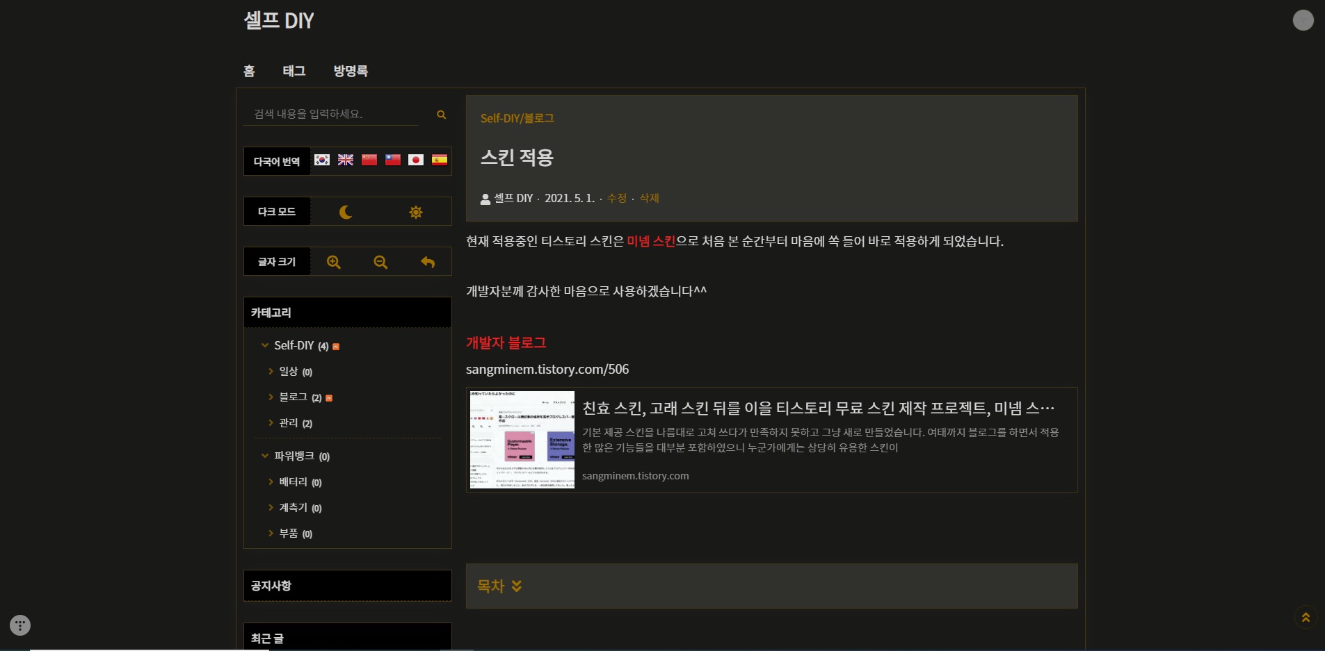 현재 적용중인 티스토리 스킨은 미넴 스킨으로 처음 본 순간부터 마음에 쏙 들어 바로 적용하게 되었습니다.